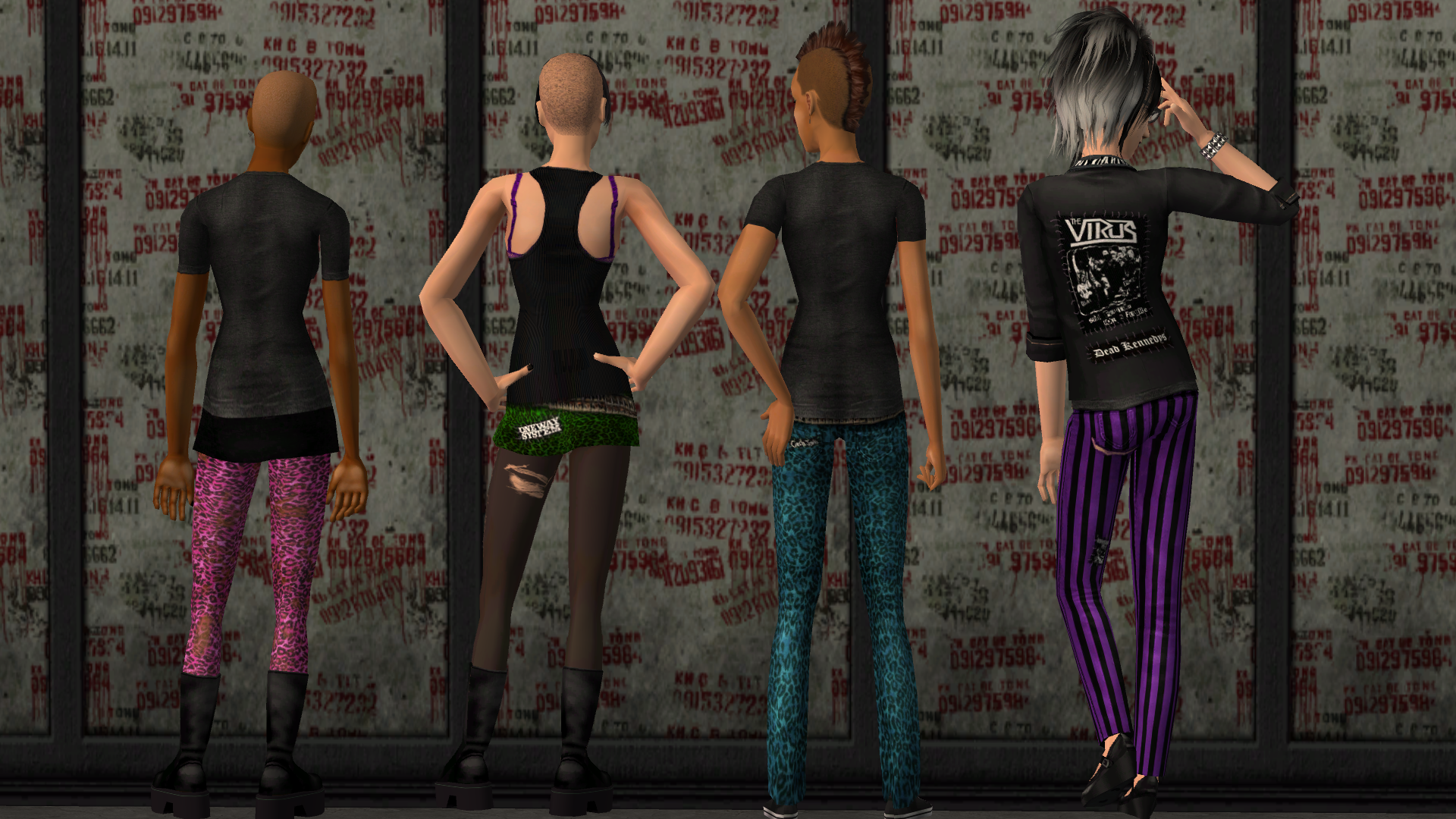 DOWNLOAD BOTH SETS HEREAll except for one just used the base game punk outfit which also happens to have an adult version, so it was just a matter of copy and pasting the teen textures onto a new recolor of the adult outfit! The only mesh that I used was conveniently my own adult conversion of Berg's Leather Jacket With Skinny Pants mesh for teens, and it is included :) All credit to izlude7980 for all of the outfits, textures and whatnot.